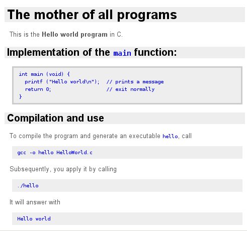In the browser view of the example of C code the literal block appears with a border around the grey block, and ordinary code blocks have only a grey background.