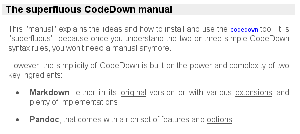 The use of CodeDown only makes sense when the strength and features of Markdown are understood and appreciated. We therefore start with a recap of this lightweight markup language.